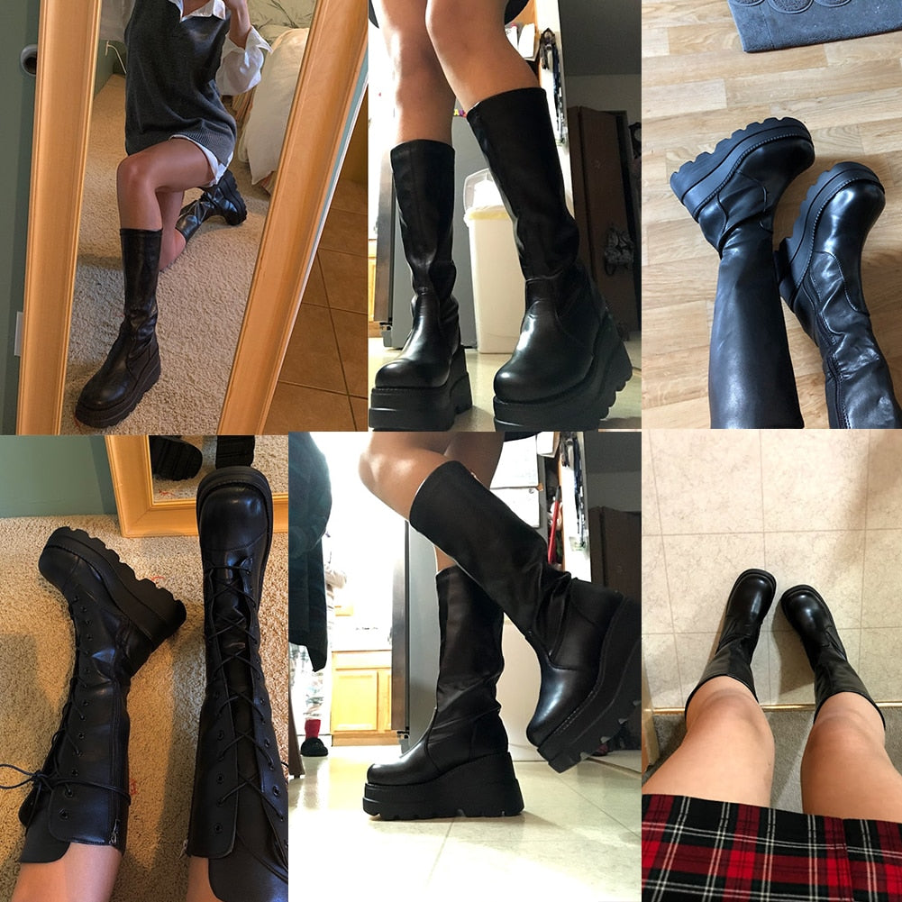 BONJOMARISA ladies fashion platform boots chunky heel wedges mid calf women boots casual brand thick bottom winter shoes woman -